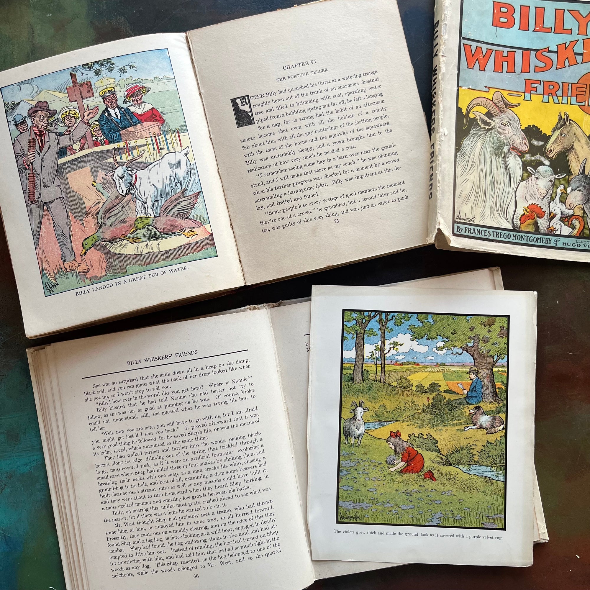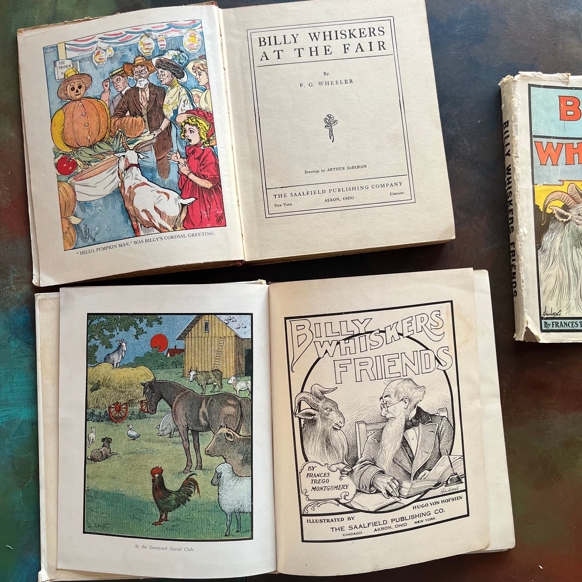 Condition:  Cover and spine wear noted especially around the edges - there is damage to the spine at the very top as shown in the photos of Billy Whiskers at the Fair.  As would be expected of any book over 100 years old, these books have been well-loved and well-read over the years. Still bound tightly but where the front and back covers meet the spine is definitely flimsy at best.  No missing pages noted - an illustration in Bill Whiskers Friends has come out of the book but is still included.  There is an inscription on the inside covers of both books. There are a few minor page tears near the spine of the book on several pages.  Foxing (age spots) are noted on the fore edges and inside covers. Both editions are filled with both full-color, full-page illustrations as well as black and white illustrations.