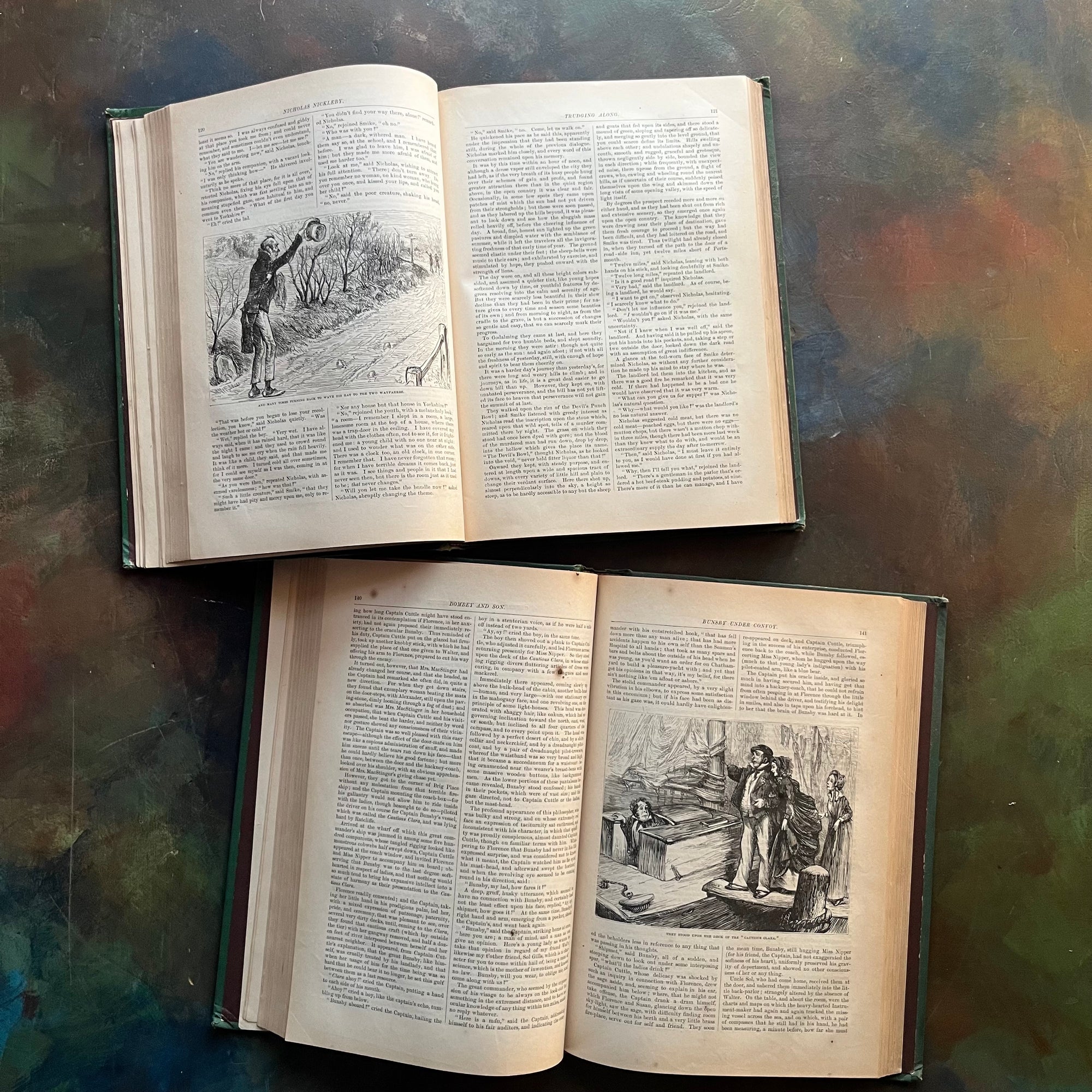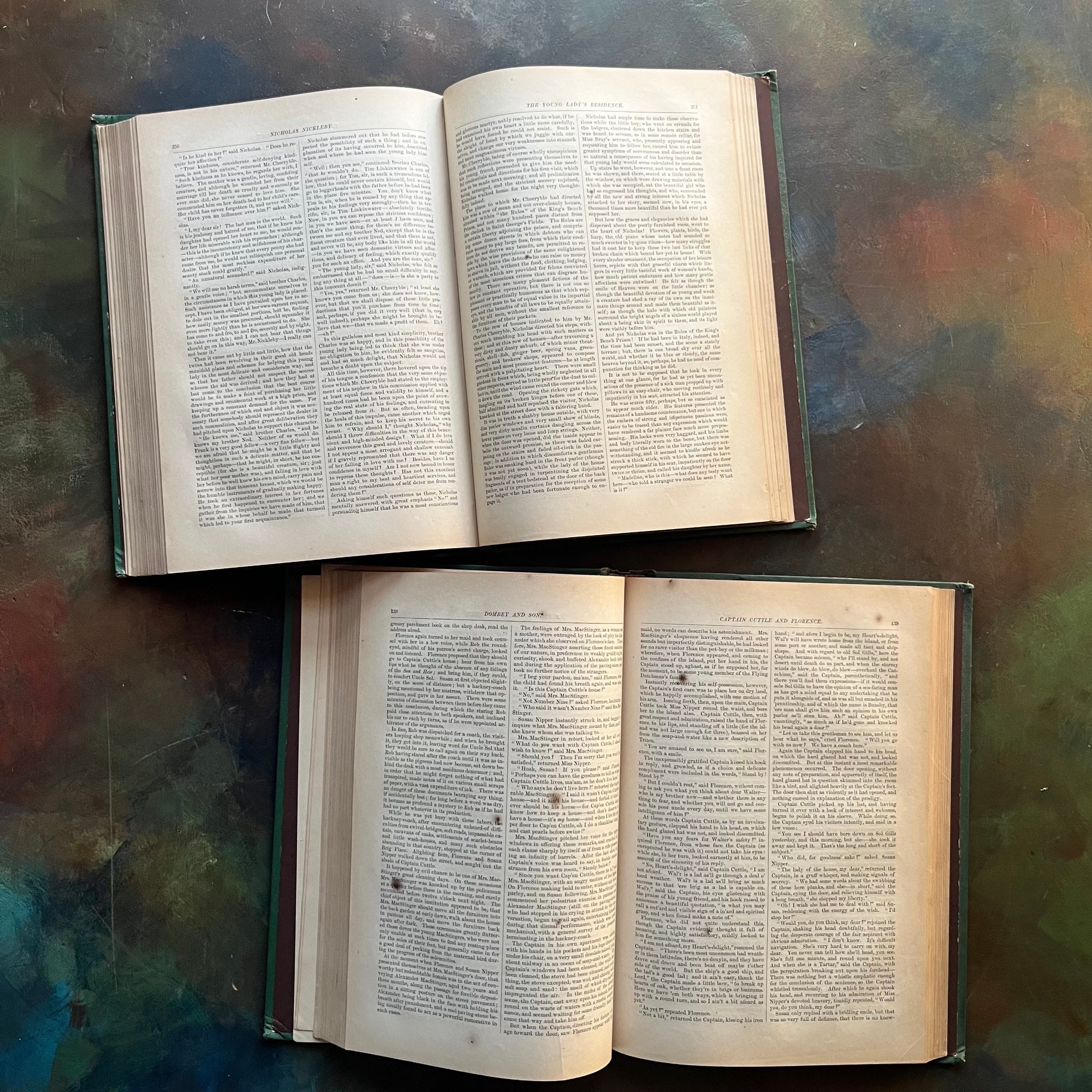 Condition:  Minor wear to the covers and spines. No writing noted.  A small page tear or two noted. The rice paper separating the frontispiece and the title page has been removed from The Life and Adventures of Nicholas Nickleby. These books are tightly bound. Foxing (age spots) are noted in both books although Dombey and Son has more noted throughout the pages.