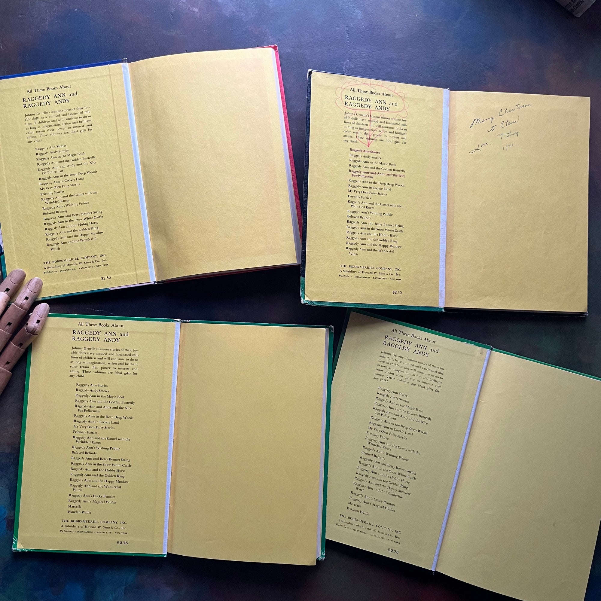 Condition: Cover and spine wear noted around the edges. No torn or missing pages noted. There is an inscription on the inside cover of Raggedy Ann and Andy and the Nice Fat Policeman. There is also a drawing of a flower on the inside cover in the same book. A few of the illustrations have been colored on in that edition as well as one page of scribble noted. There is a page with three small holes punched into the book as well - it looks like someone was playing with a hole punch before getting caught - kids! No other writing noted in the other books. No torn or missing pages noted. Each book is tightly bound with no damage to the hinges noted. There is a