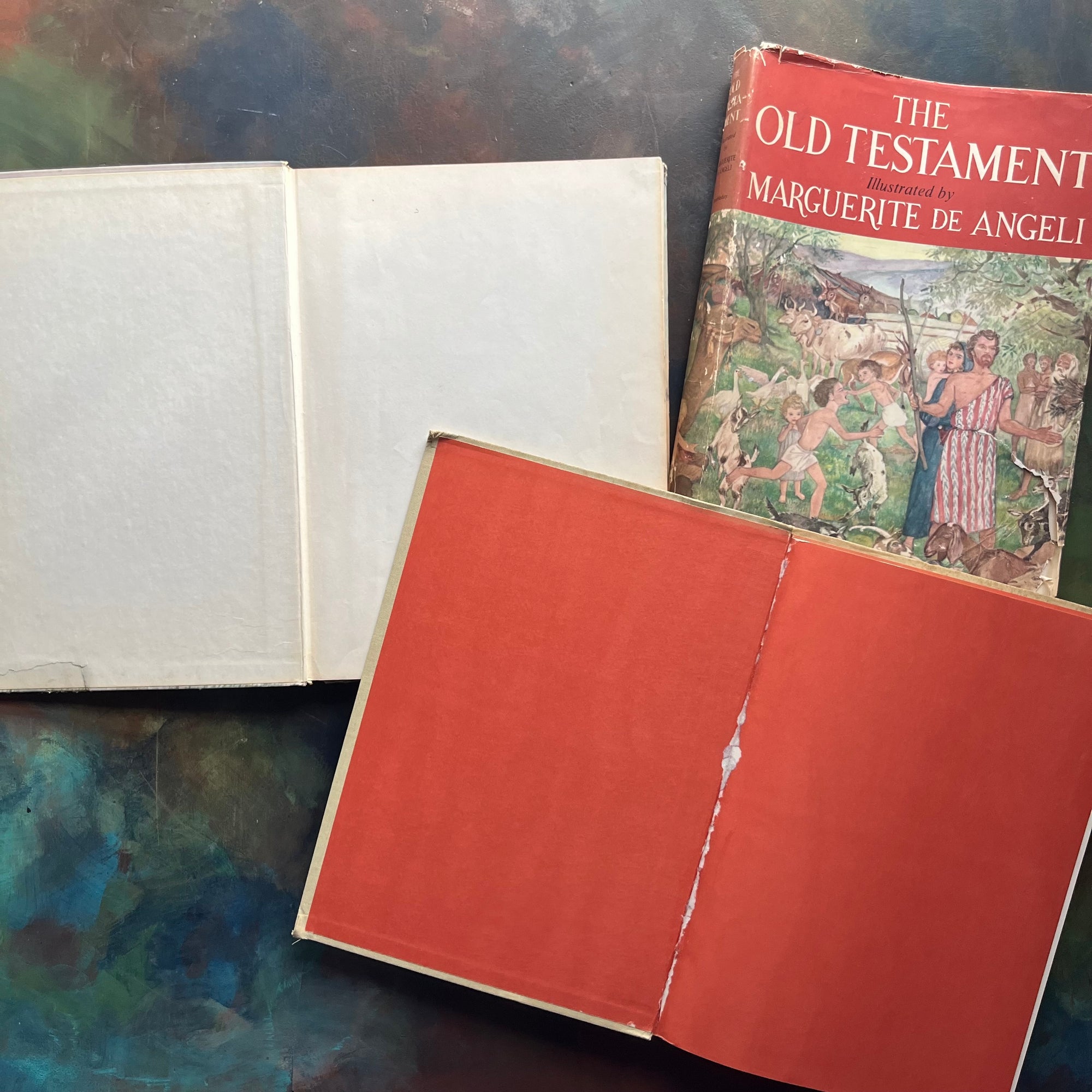Condition: Cover and spine wear noted especially around the edges of the dust jacket of The Old Testament including tears on the front cover. Minor cover and spine wear noted around the edges of both books. No writing, torn or missing pages noted. There is a tear in the front cover of The Mother Goose book at the bottom. Both books are tightly bound with no damage to their hinges. The inside cover of The Old Testament appears to be cracked, however the glue used to bind the book has just pulled the endpapers apart exposing the white underpaper.