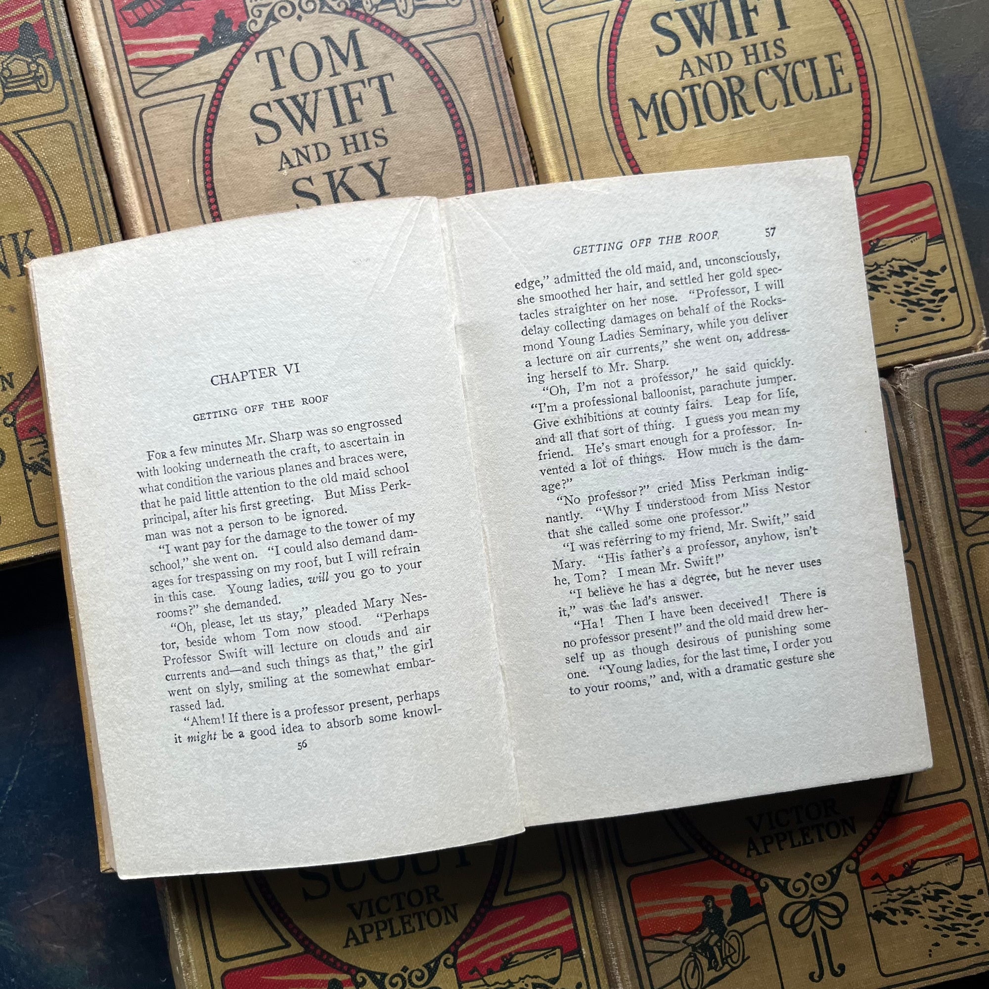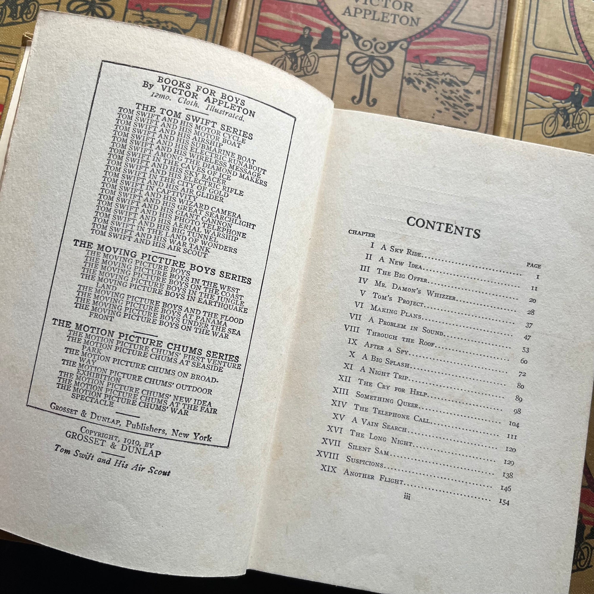 Title: Set of 7 Vintage Tom Swift Books - these are part of the original series published in the early 1900's. The set includes Tom Swift and His War Tank, Tom Swift and His Sky Train, Tom Swift and His Motorcycle, Tom Swift and His Airship, Tom Swift and His Air Scout, Tom Swift and His Air Glider, and Tom Swift an His Flying Boat