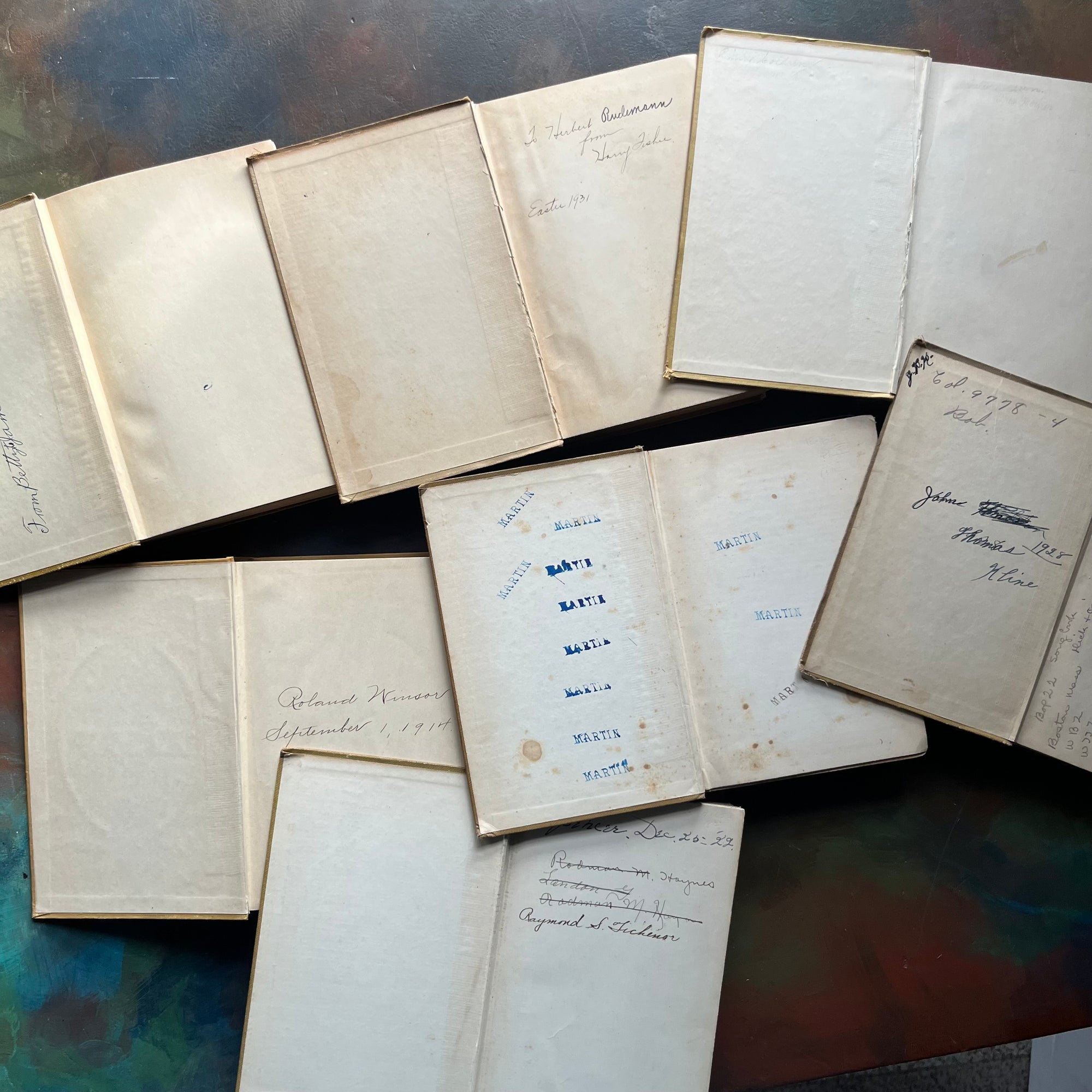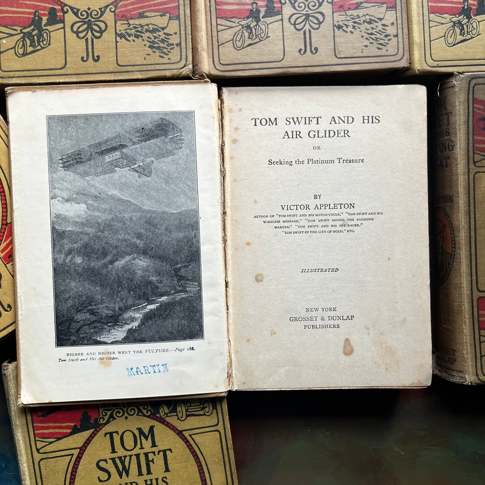 Condition: Cover and spine wear noted around the edges. These editions have been well loved over the years and they show it. Writing is noted in most inside covers. Foxing (age spots) are noted in several editions. Tom Swift and His Air Glider shows the most wear. Someone took a last name stamp and added it onto multiple pages within the book - mostly in the front of the book. No other writing noted. No missing pages noted.