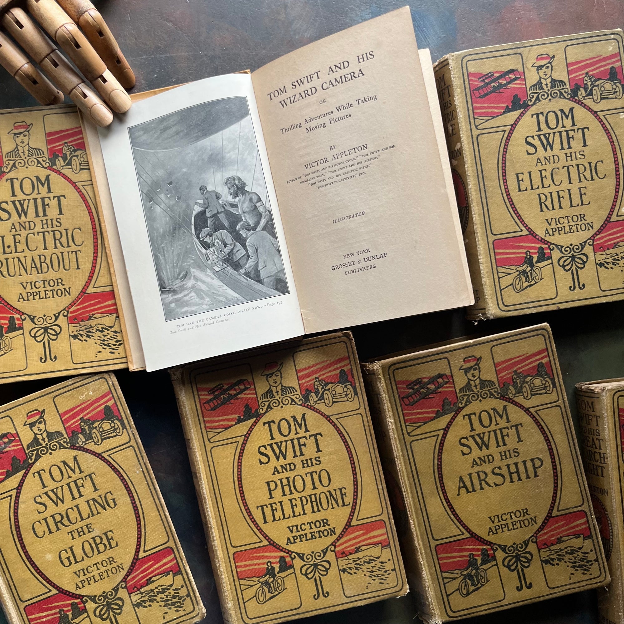 Title: Set of 7 Vintage Tom Swift Books - these are part of the original series published in the early 1900's. The set includes Tom Swift and His Great Search Light, Tom Swift and His Airship, Tom Swift and His Photo Telephone, Tom Swift Circling the Globe, Tom Swift and His Electric Rifle, Tom Swift and His Wizard Camera, and Tom Swift an His Electric Runabout